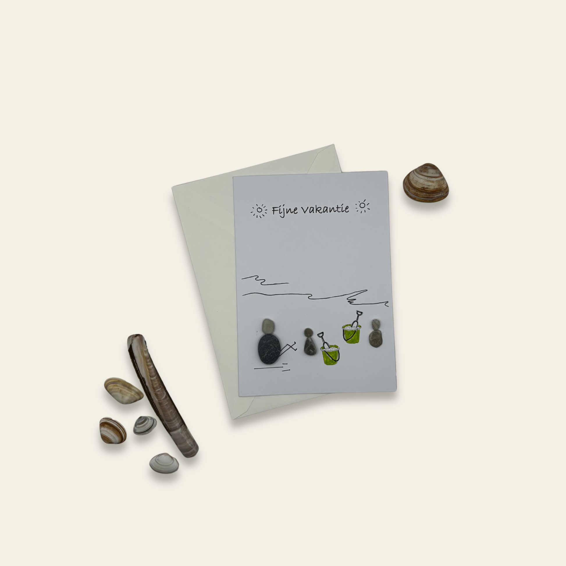 Met een stijlvol formaat van 10,5x14,5 cm en een natuurlijke verfijnde uitstraling is elke kaart een klein kunstwerk. De kaarten zijn met zorg samengesteld uit natuurlijke materialen zoals steentjes en schelpjes, gecombineerd met sierlijke accenten. Geen enkele kaart is hetzelfde, waardoor jouw gebaar extra persoonlijk aanvoelt. Perfect om te versturen of zo te geven. De kaart wordt geleverd met een witte enveloppe.