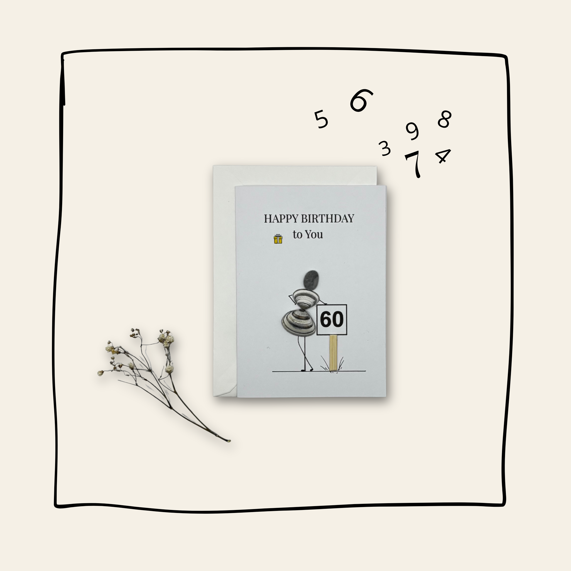 Met een stijlvol formaat van 10,5x14,5 cm en een natuurlijke verfijnde uitstraling is elke kaart een klein kunstwerk. De kaarten zijn met zorg samengesteld uit natuurlijke materialen zoals steentjes en schelpjes, gecombineerd met sierlijke accenten. Geen enkele kaart is hetzelfde, waardoor jouw gebaar extra persoonlijk aanvoelt. Perfect om te versturen of zo te geven. De kaart wordt geleverd met een witte enveloppe.